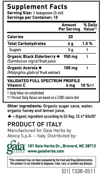 Black Elderberries have been recognized for centuries throughout Europe for their immune supportive properties. Gaia Herbs GaiaKids Black Elderberry Syrup is a great tasting all-natural syrup, made from Certified Organic Black Elderberries and added Acacia honey, can be taken by children daily or on occasion to support their immune systems. Honey offers tasty and soothing support for the upper respiratory system. Gaia Herbs GaiaKids Black Elderberry Syrup's formula contains no artificial flavors or colors, no preservatives, and no high fructose corn syrup.